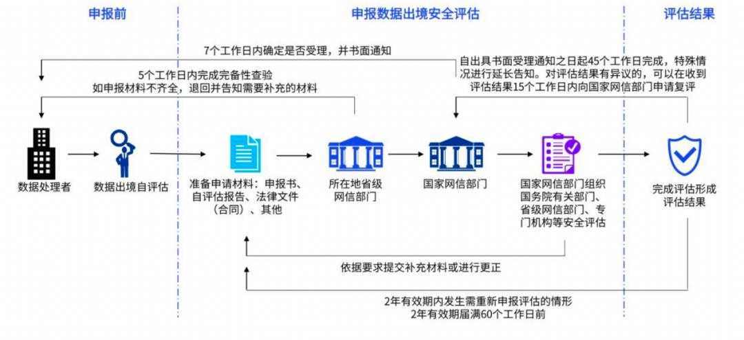 数据出境申报流程: 准备: 企业需要准备自评估报告、申报书、拟定法律文件的申报材料进行自评估。 递交: 然后递交申报材料给省级网信部门,由省级网信部门在5个工作日内审核其完备性。 审核: 审核通过后交由国家级网信办部门在申报材料之日起7个工作日确认受理,不予受理则安全评估终止; 评估: 受理后,组织评估组进行评估,一般评估周期为45个工作日。 补充及复评: 不符合则需要通知企业补充更正材料,拒不补充则安全评估终止。如果对评估结果通知有异议,则可以申请复评,最终以复评结果为最终结论,一般申请复审的时间为15个工作日内。 有限期: 评估有限期为2年。如果有效期两年届满,需要继续开展数据出境,或者数据出境环境发生变化,则需要重新申报评估。