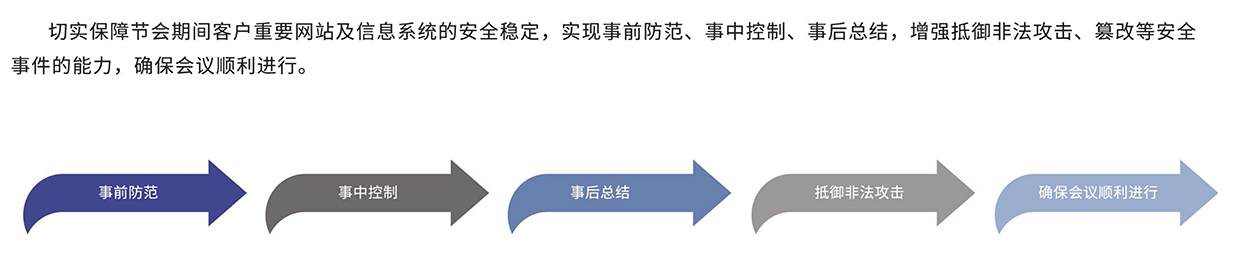 近年来,我国承办重要国际多边会议以及国内重要会议和活动越来越多,重大节会的安全保障是重中之重。放眼世界,重大节会安保也已成为世界各国面临的共同难题,安全第一成为活动主办的国际共识。重大节会安全保障方案在特殊时期或者重大节会为客户提供现场安全保障整体解决方案,全面保障客户信息系统安全。